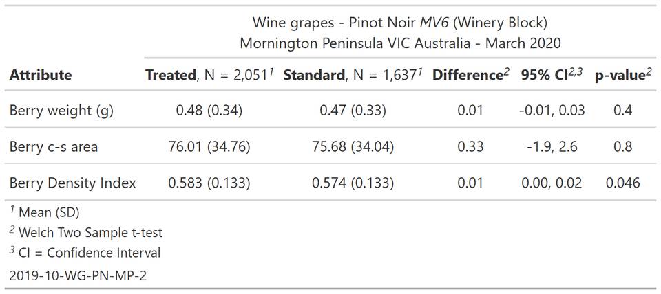 Table 2 summarises measurements of 3,688 berries. Treated berries have a significantly (p = 0.046) higher Berry Density Index. There is no significant difference in berry "size" as measured by either berry weight or berry cross-sectional (berry c-s) area.