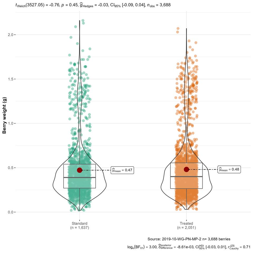 Figure 4 Individual berry weight of 3,688 berries across both Treated and Standard bunches, each dot represents a berry. Note the binomial distribution of hen (larger) and chicken (smaller) berries. No significant difference exists in berry weight between Treated and Standard bunches.