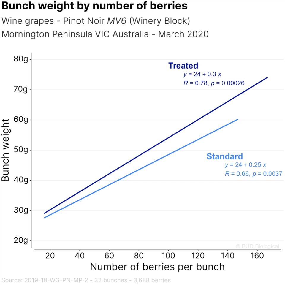 Figure 1 Biostimulant Treated Pinot Noir bunches were significantly heavier +28% than Standard bunches (p = 0.008).