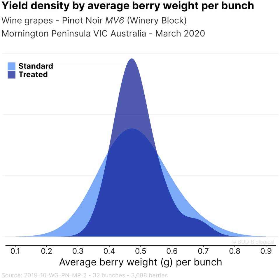 The yield density plot in Figure 3 shows the improved uniformity in average berry weight per bunch of the Treated vines.